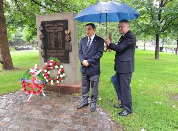 Mimo ulewnego deszczu członkowie naszego Koła, korpus dyplomatyczny w osobach Ambasadora RP Pana Zenona Kosiniak-Kamysza, radcy ministra Pana Dariusza Mańczyka, konsula RP w Kanadzie Pana Mateusza Reszczyka oraz liczna Polonia zebrali się przed tablicą pamiątkową poświęconą lotnikom kanadyjskim , którzy zginęli niosąc pomoc walczącej Warszawie, aby złożyć hołd bohaterskim powstańcom. W imieniu Koła wieniec złożyła Koleżanka kapitan Ewa Konopacka uczestnik Powstania Warszawskiego, odznaczona Orderem Virtuti Militarni, w asyście męża kapitana Tadeusza Konopackiego (porucznika AK w czasie Powstania). W imieniu Rzeczpospolitej Polski wieniec złożył Pan Ambasador w asyście Konsula RP w Ottawie.